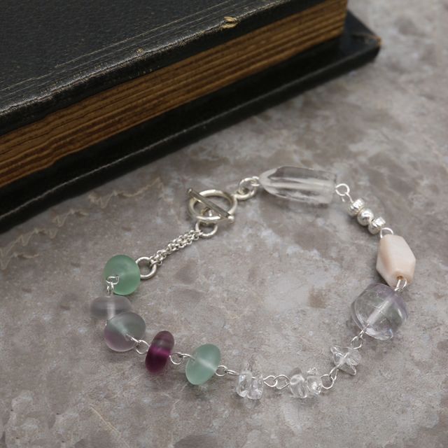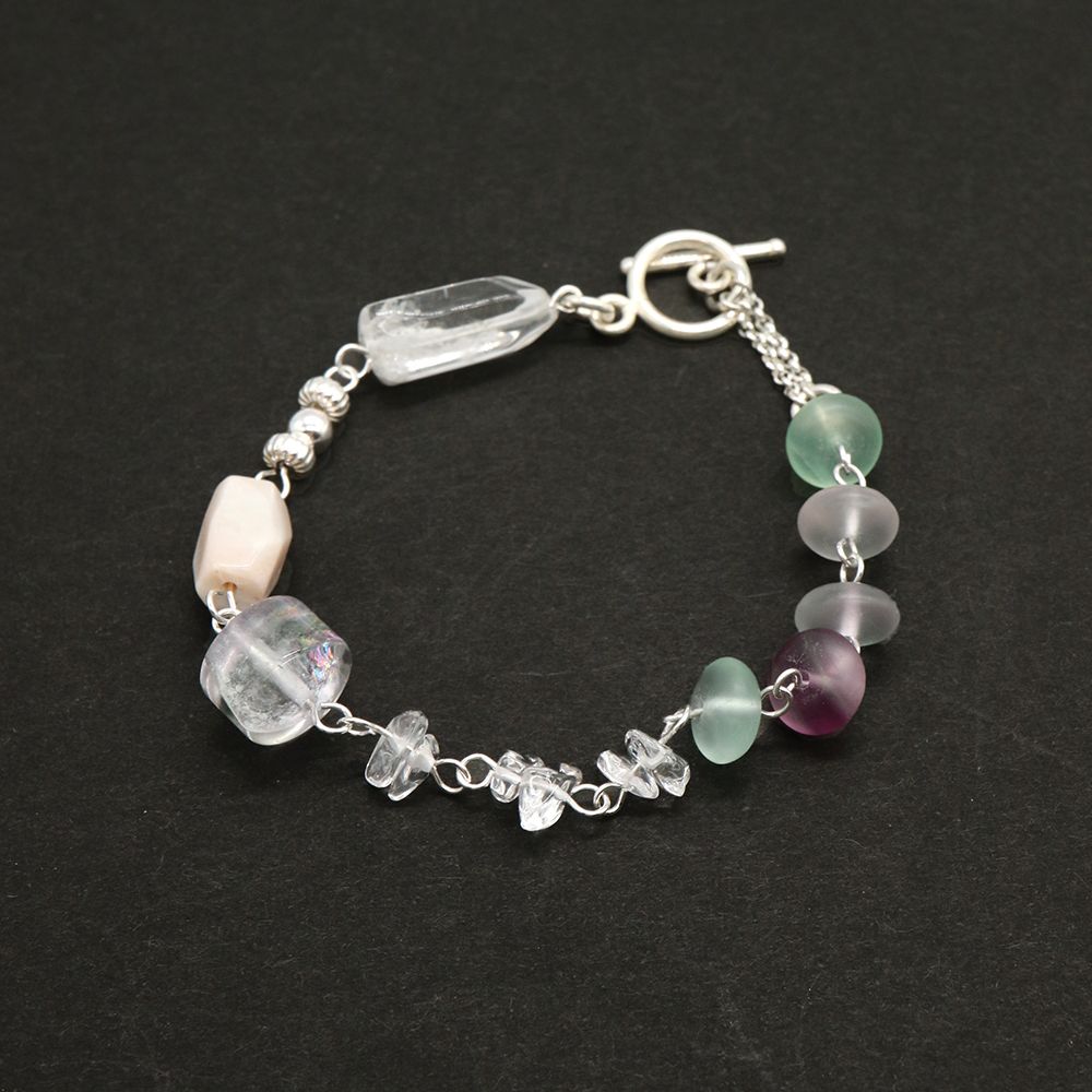 透明感あふれるフローライトを中心に、クオーツ、希少なハーキマーダイヤモンド、上品なパールを組み合わせた、優しい光をまとうブレスレットです。