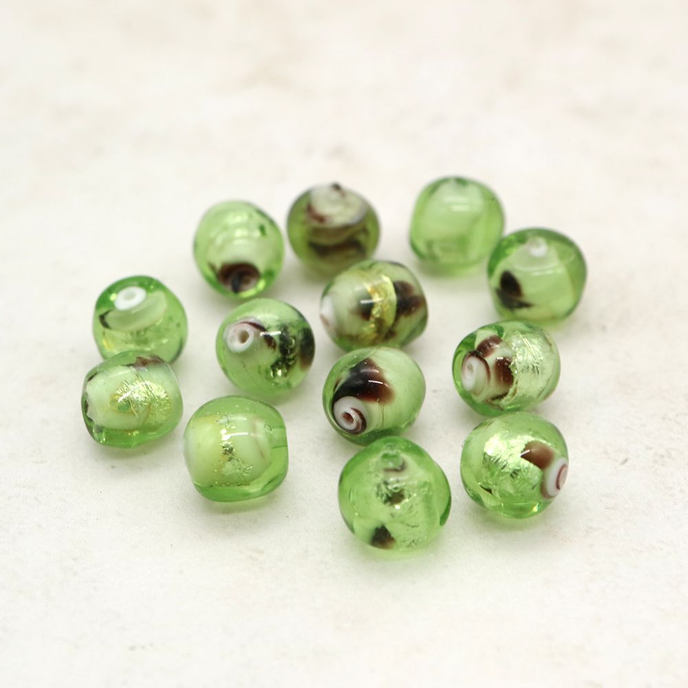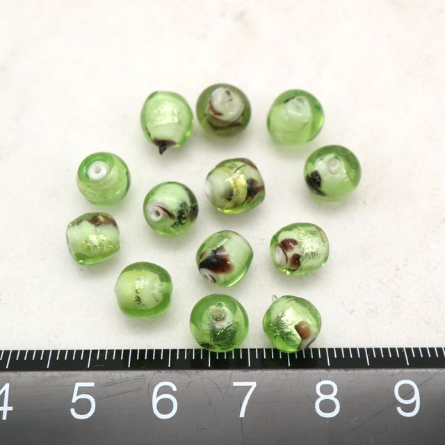 透明感のあるアップルグリーンに、ブラウンとホワイトのマーブル模様を内包したガラスビーズ。内部に銀箔のような揺らぎが見られる個体もあり、ランプワーク(とんぼ玉)技法による装飾の可能性が高い一品です。