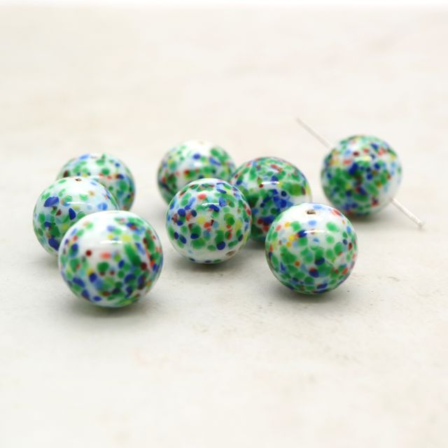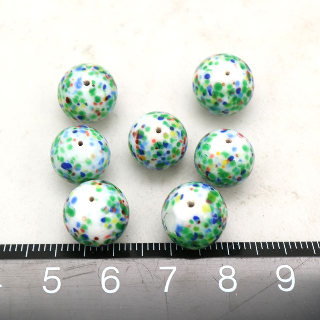 ホワイトベースに、グリーン・ブルー・レッドのカラーチップを散らしたポップで愛らしいガラスビーズ。