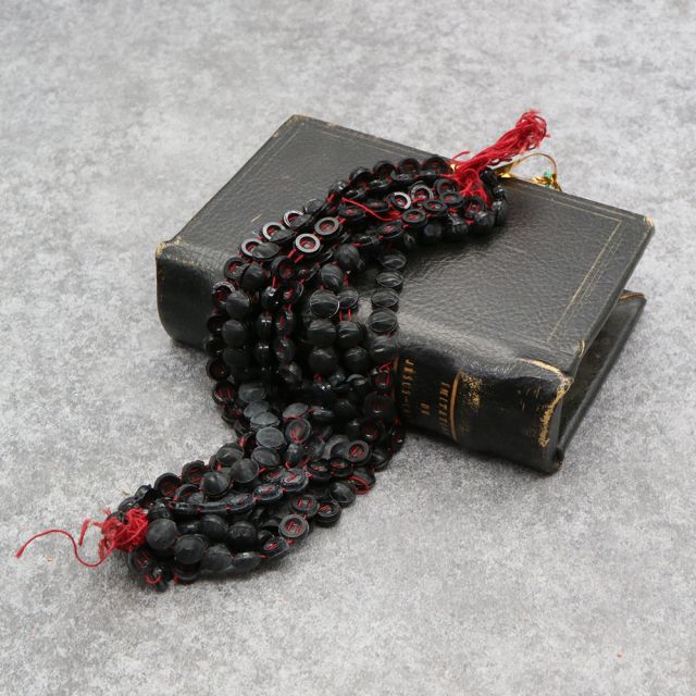 19世紀末から20世紀初頭にかけてフランスやボヘミア(現チェコ)はガラスビーズの一大生産地として知られ、特に黒い「ジェット風ガラス」や「オニキス調ガラス」は喪の装飾品やモードのアクセサリーに多用されました。
