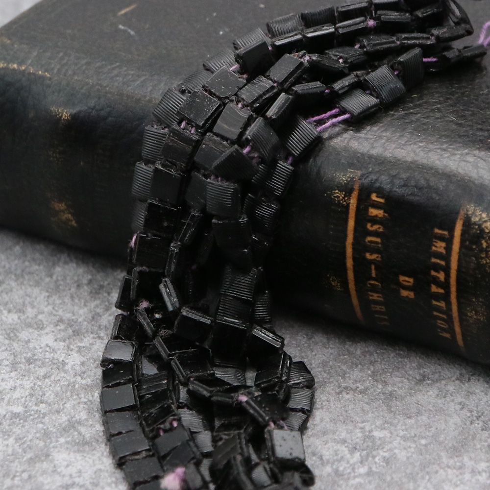 19世紀末から20世紀初頭にかけてフランスやボヘミア(現チェコ)はガラスビーズの一大生産地として知られ、特に黒い「ジェット風ガラス」や「オニキス調ガラス」は喪の装飾品やモードのアクセサリーに多用されました。