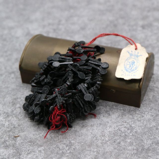 19世紀末から20世紀初頭にかけてフランスやボヘミア(現チェコ)はガラスビーズの一大生産地として知られ、特に黒い「ジェット風ガラス」や「オニキス調ガラス」は喪の装飾品やモードのアクセサリーに多用されました。