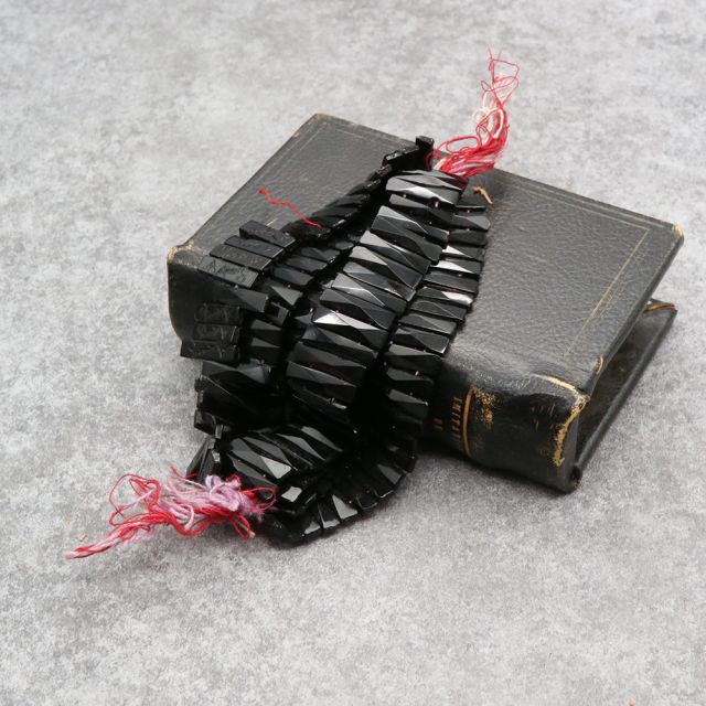 19世紀末から20世紀初頭にかけてフランスやボヘミア(現チェコ)はガラスビーズの一大生産地として知られ、特に黒い「ジェット風ガラス」や「オニキス調ガラス」は喪の装飾品やモードのアクセサリーに多用されました。
