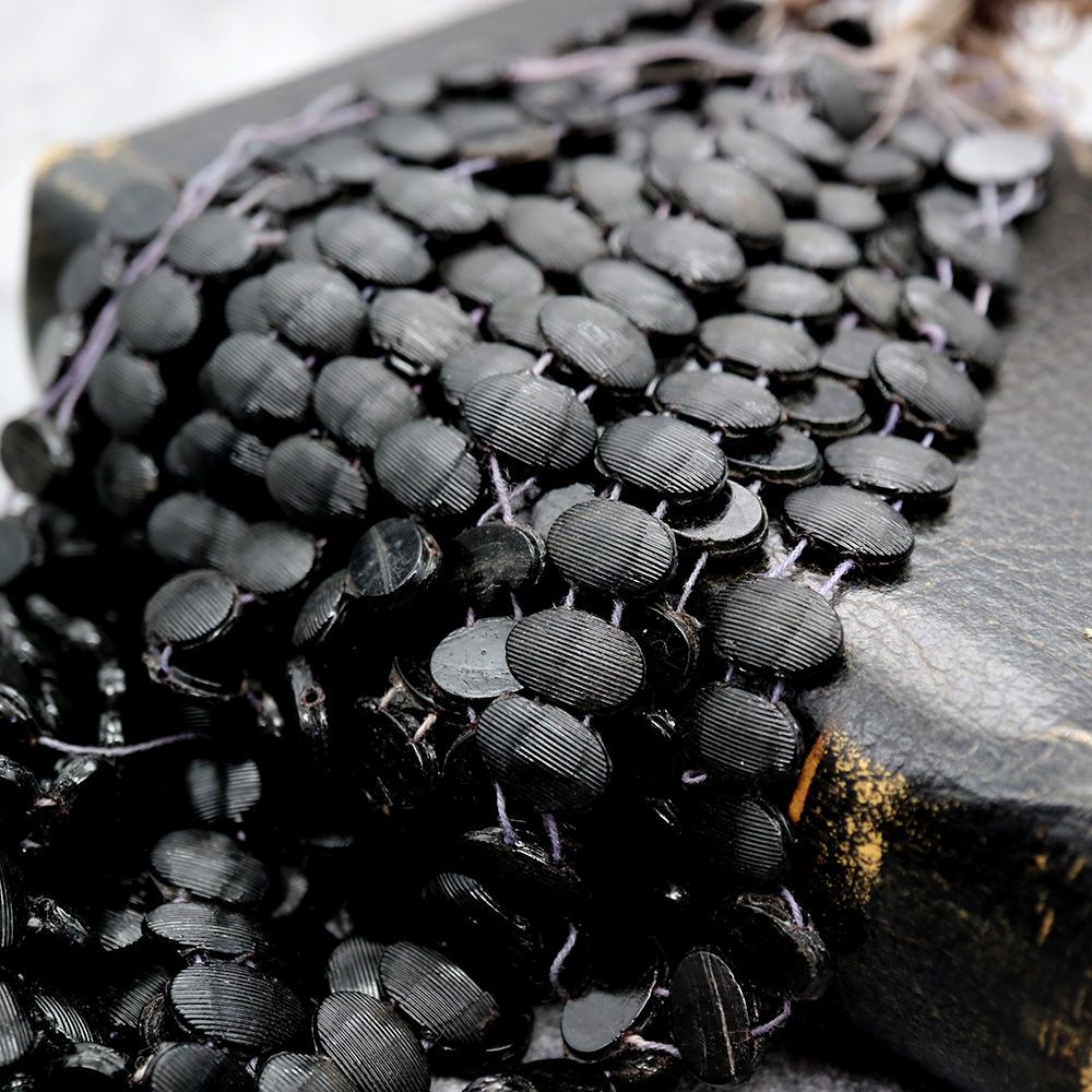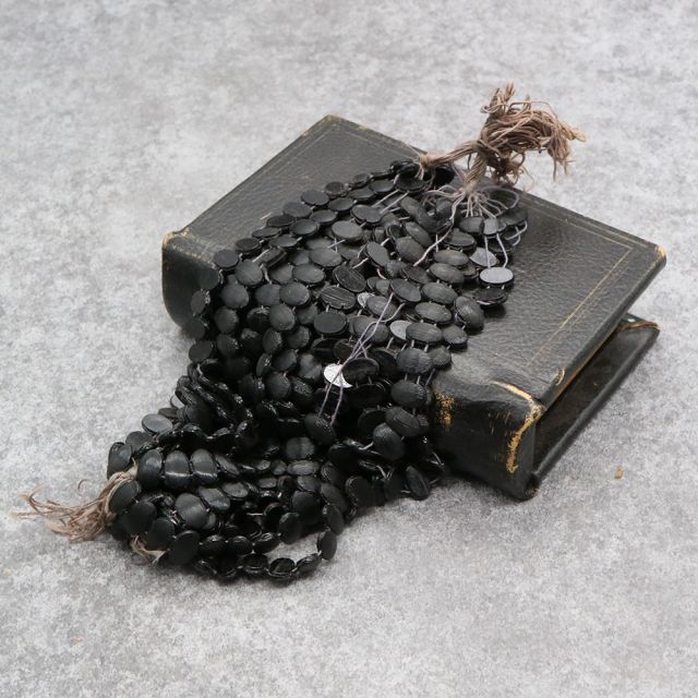 19世紀末から20世紀初頭にかけてフランスやボヘミア(現チェコ)はガラスビーズの一大生産地として知られ、特に黒い「ジェット風ガラス」や「オニキス調ガラス」は喪の装飾品やモードのアクセサリーに多用されました。
