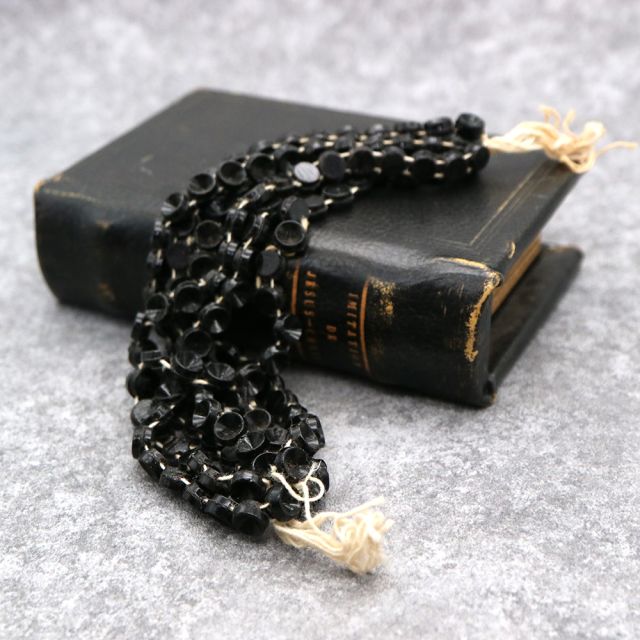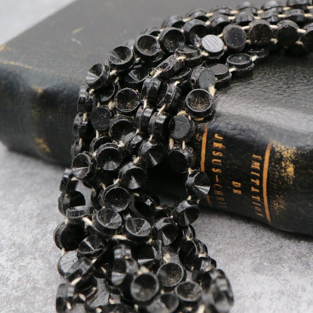 19世紀末から20世紀初頭にかけてフランスやボヘミア(現チェコ)はガラスビーズの一大生産地として知られ、特に黒い「ジェット風ガラス」や「オニキス調ガラス」は喪の装飾品やモードのアクセサリーに多用されました。