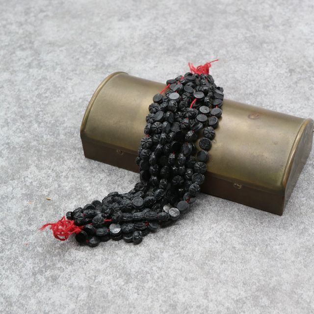19世紀末から20世紀初頭にかけてフランスやボヘミア(現チェコ)はガラスビーズの一大生産地として知られ、特に黒い「ジェット風ガラス」や「オニキス調ガラス」は喪の装飾品やモードのアクセサリーに多用されました。