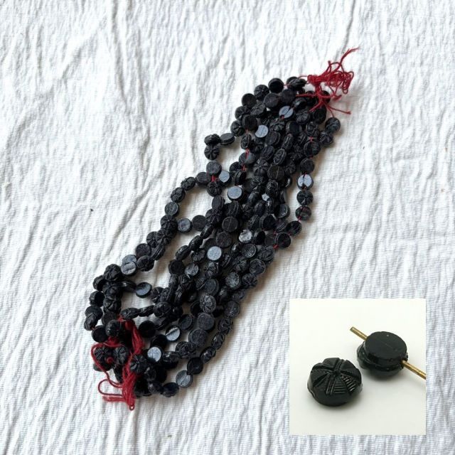 19世紀末から20世紀初頭にかけてフランスやボヘミア(現チェコ)はガラスビーズの一大生産地として知られ、特に黒い「ジェット風ガラス」や「オニキス調ガラス」は喪の装飾品やモードのアクセサリーに多用されました。