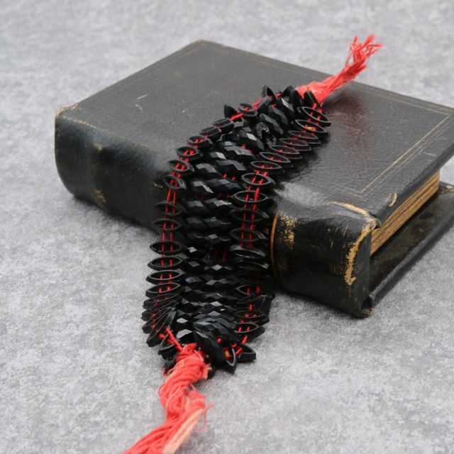 19世紀末から20世紀初頭にかけてフランスやボヘミア(現チェコ)はガラスビーズの一大生産地として知られ、特に黒い「ジェット風ガラス」や「オニキス調ガラス」は喪の装飾品やモードのアクセサリーに多用されました。