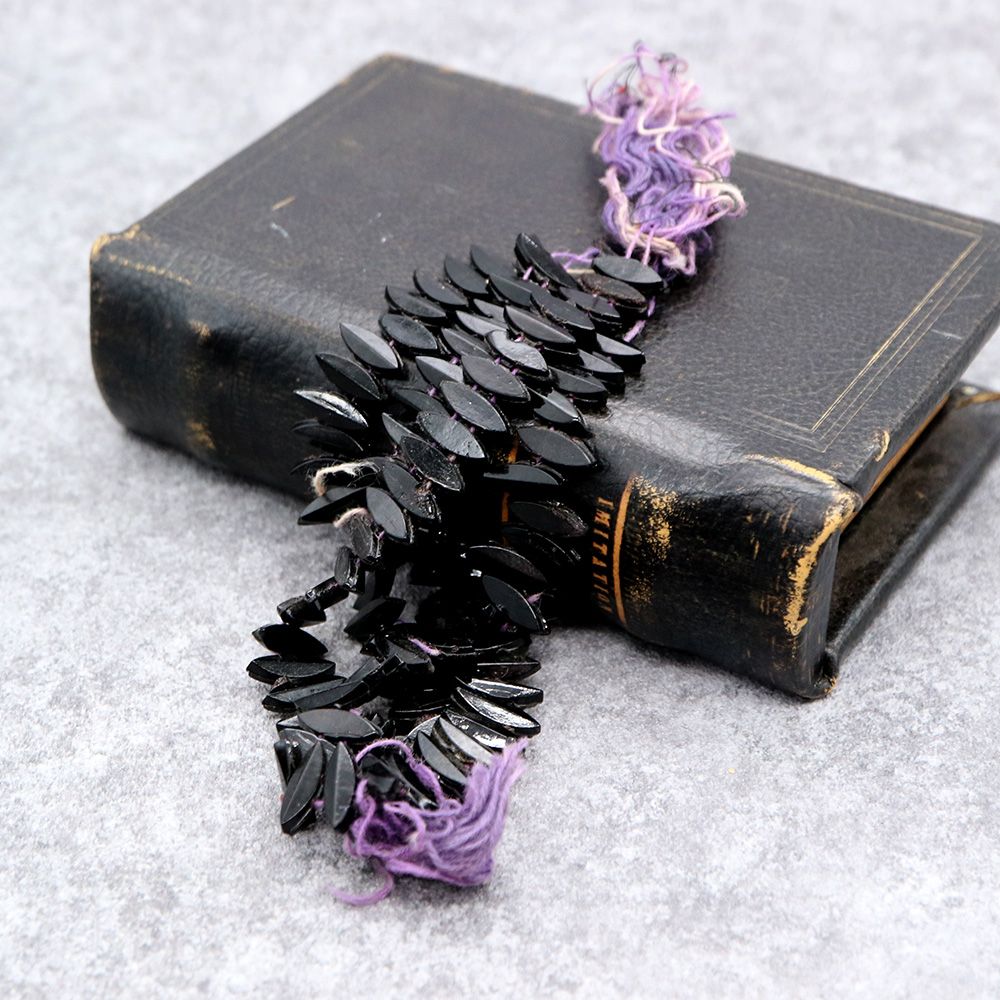 19世紀末から20世紀初頭にかけてフランスやボヘミア(現チェコ)はガラスビーズの一大生産地として知られ、特に黒い「ジェット風ガラス」や「オニキス調ガラス」は喪の装飾品やモードのアクセサリーに多用されました。
