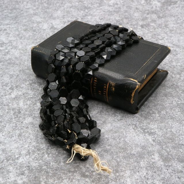 19世紀末から20世紀初頭にかけてフランスやボヘミア(現チェコ)はガラスビーズの一大生産地として知られ、特に黒い「ジェット風ガラス」や「オニキス調ガラス」は喪の装飾品やモードのアクセサリーに多用されました。
