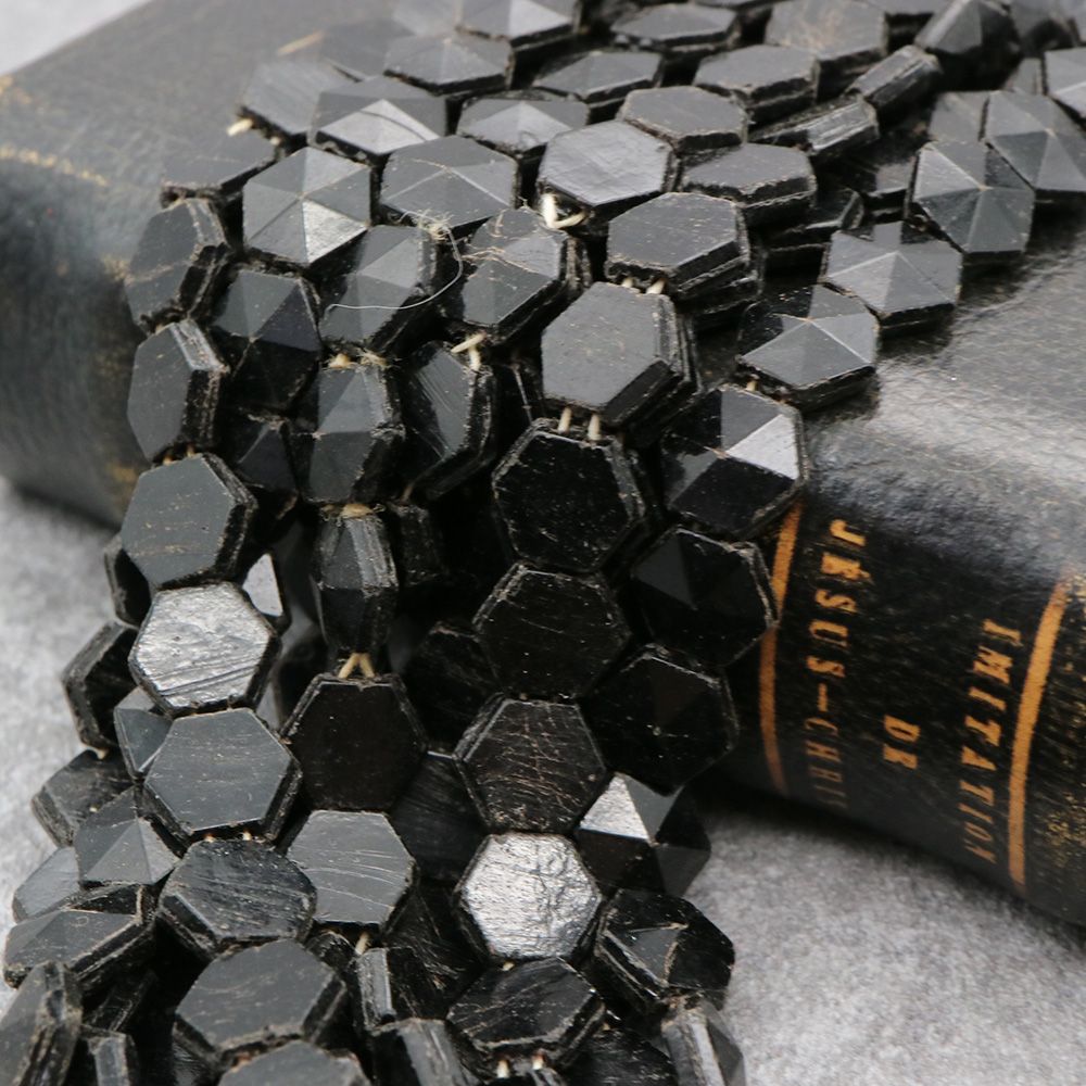 19世紀末から20世紀初頭にかけてフランスやボヘミア(現チェコ)はガラスビーズの一大生産地として知られ、特に黒い「ジェット風ガラス」や「オニキス調ガラス」は喪の装飾品やモードのアクセサリーに多用されました。