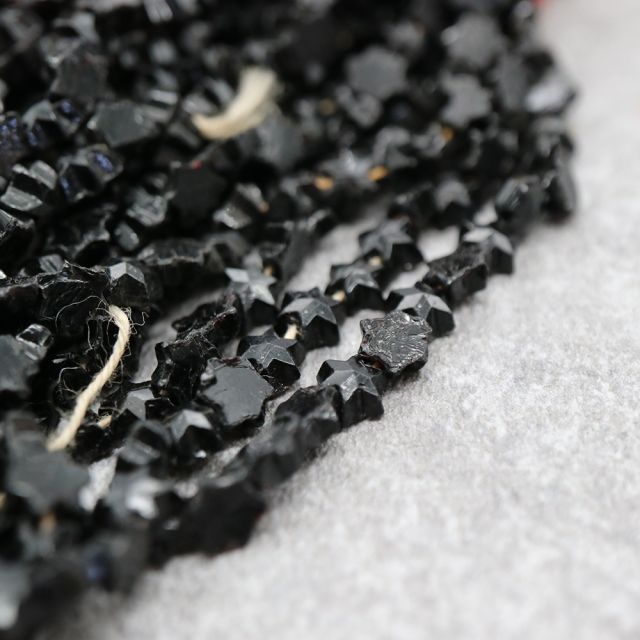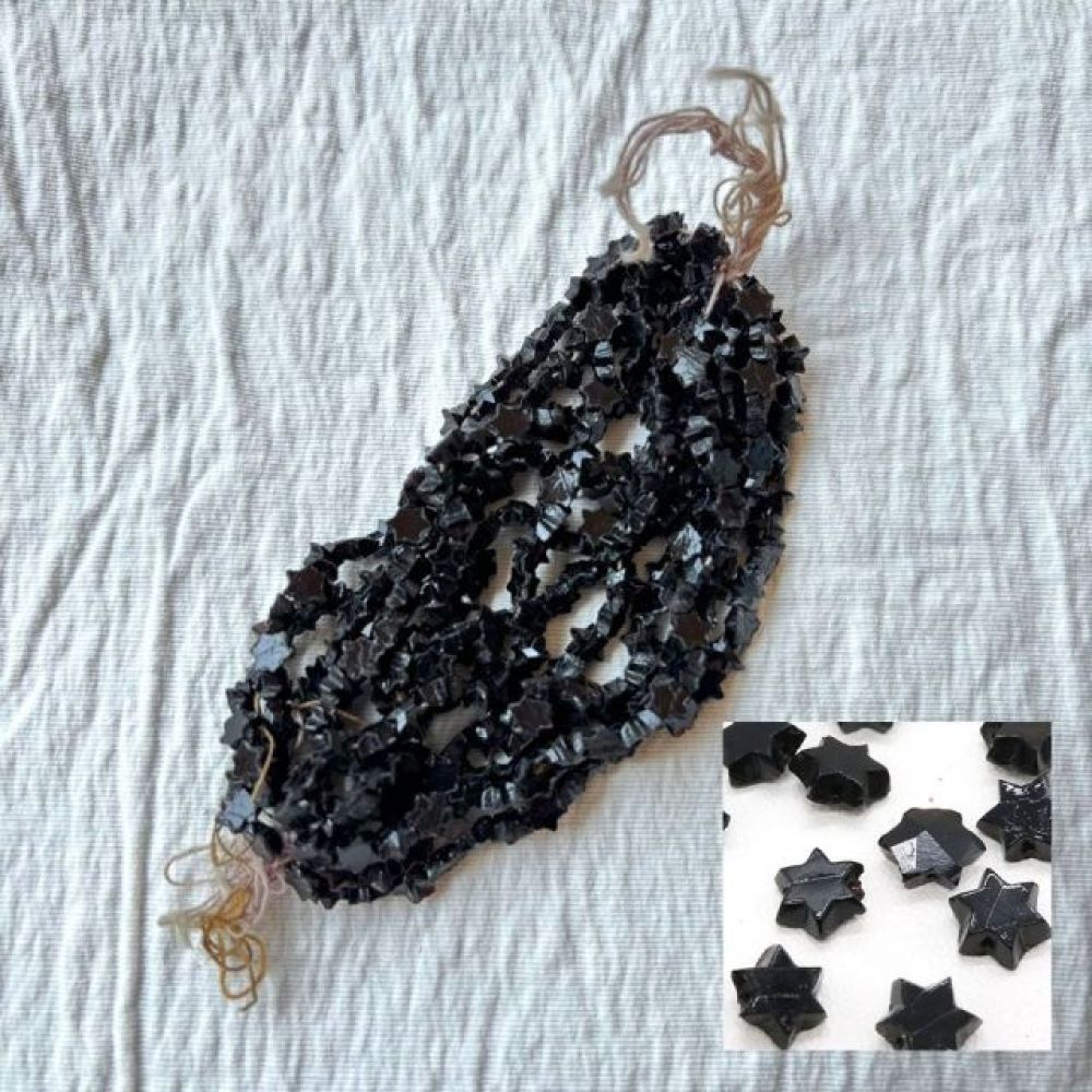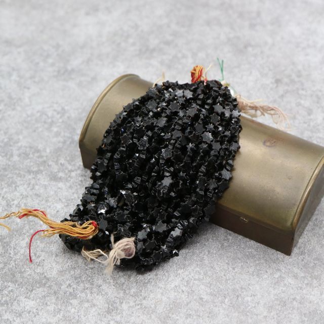 19世紀末から20世紀初頭にかけてフランスやボヘミア(現チェコ)はガラスビーズの一大生産地として知られ、特に黒い「ジェット風ガラス」や「オニキス調ガラス」は喪の装飾品やモードのアクセサリーに多用されました。