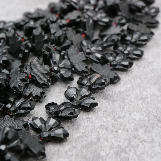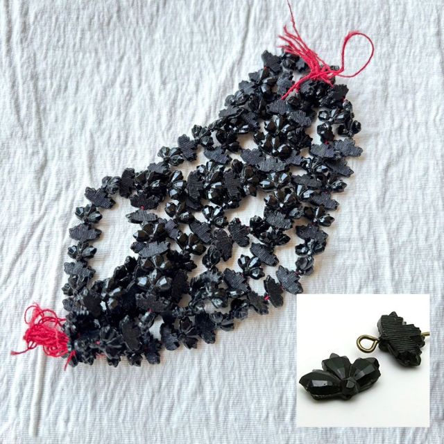 19世紀末から20世紀初頭にかけてフランスやボヘミア(現チェコ)はガラスビーズの一大生産地として知られ、特に黒い「ジェット風ガラス」や「オニキス調ガラス」は喪の装飾品やモードのアクセサリーに多用されました。