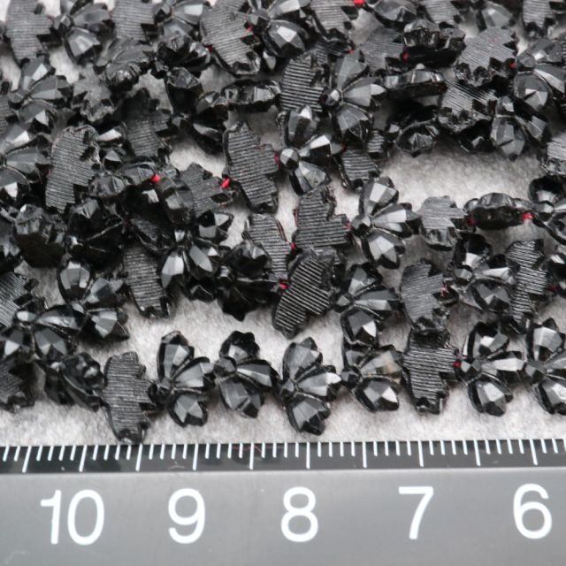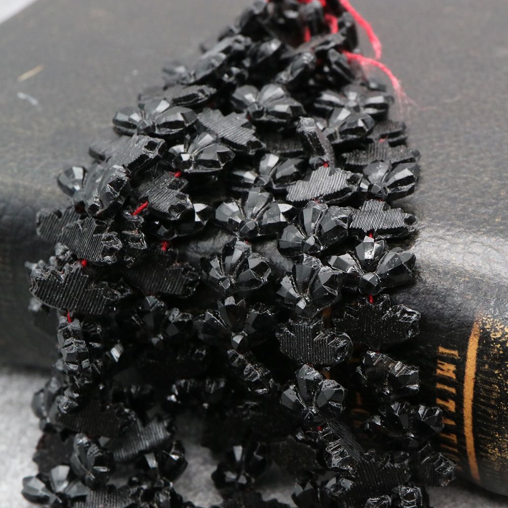 19世紀末から20世紀初頭にかけてフランスやボヘミア(現チェコ)はガラスビーズの一大生産地として知られ、特に黒い「ジェット風ガラス」や「オニキス調ガラス」は喪の装飾品やモードのアクセサリーに多用されました。
