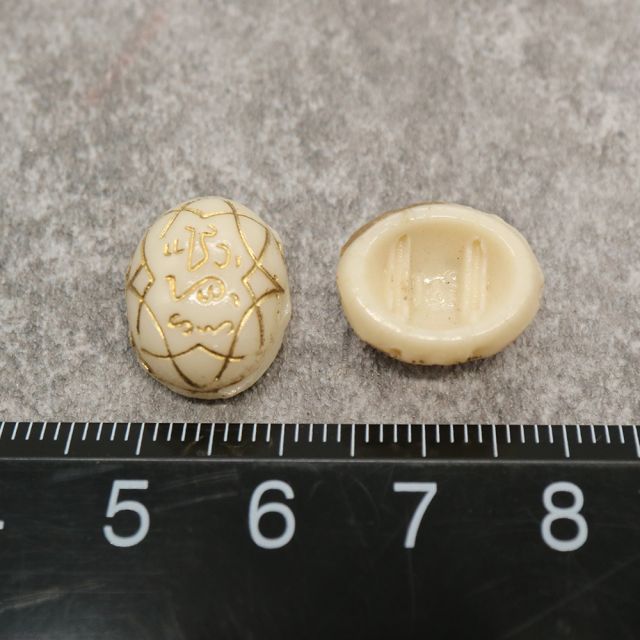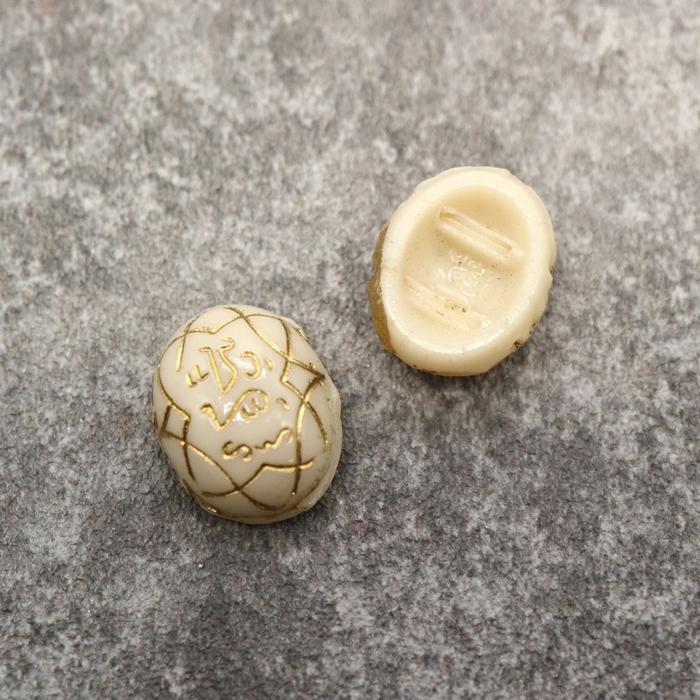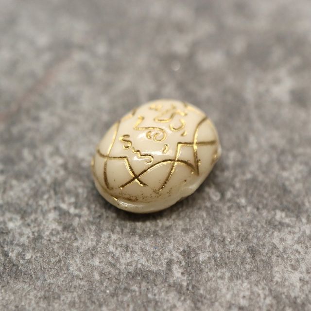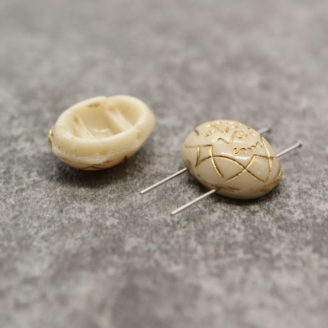 20世紀前半から中頃にかけて、ヨーロッパで流通していた装飾用ガラスパーツです。やわらかなアイボリー色のガラスに、金彩で描かれた幾何学的な文様が施されており、アール・デコ期から戦後にかけての装飾デザインの影響を感じさせます。