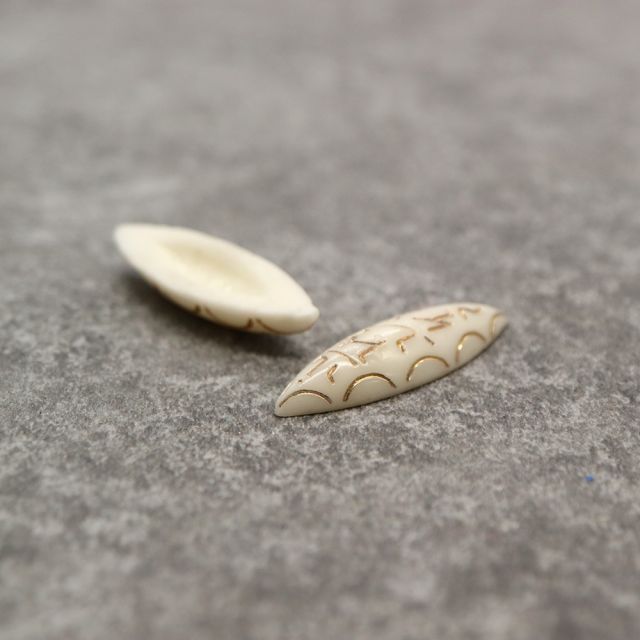 20世紀前半から中頃にかけて、ヨーロッパで流通していた装飾用ガラスパーツです。やわらかなアイボリー色のガラスに、金彩で描かれた幾何学的な文様が施されており、アール・デコ期から戦後にかけての装飾デザインの影響を感じさせます。