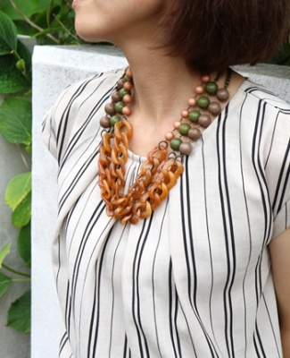 琥珀のマスタードカラーチェーンをボリューミーに重ね、