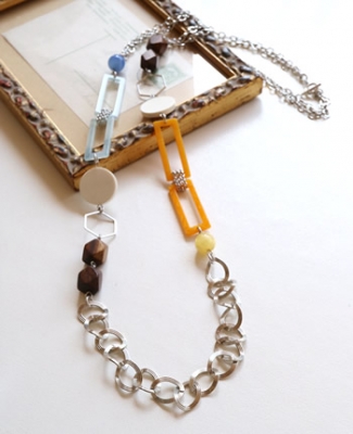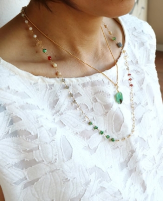 形も色も質感も違う天然石やチェーンをアシンメトリーにバランスよくつなげて